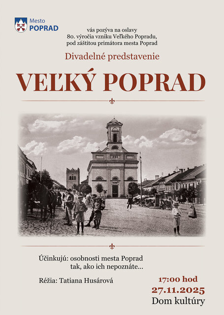 Mesto Poprad vás srdečne pozýva na oslavy 80. výročia vzniku Veľkého Popradu. Príďte si vychutnať jedinečné divadelné predstavenie, ktoré vás prevedie históriou mesta Poprad.